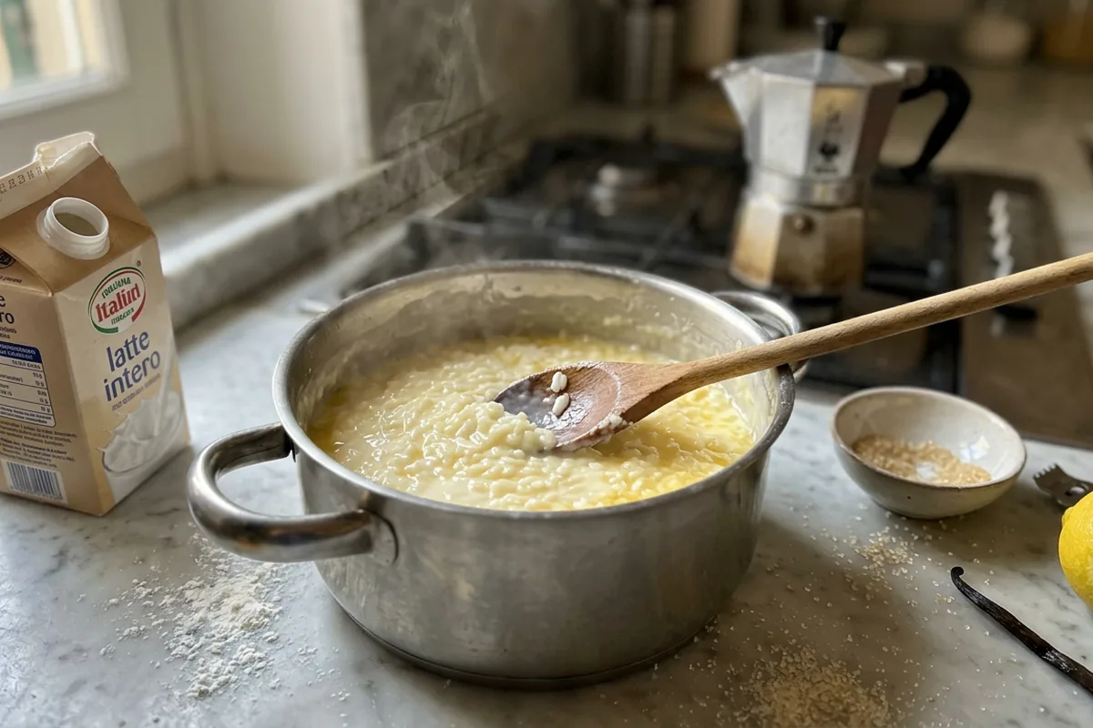 Appena compaiono le prime bolle, abbassa subito la fiamma al minimo. Il riso al latte ha bisogno di cottura dolce, mai bollore vivace: il latte non deve “saltare”, ma solo fremere. Mescola con un cucchiaio di legno o silicone, insistendo sul fondo per evitare che il riso si attacchi e si bruci, perché basta un punto scuro per rovinare l’aroma.